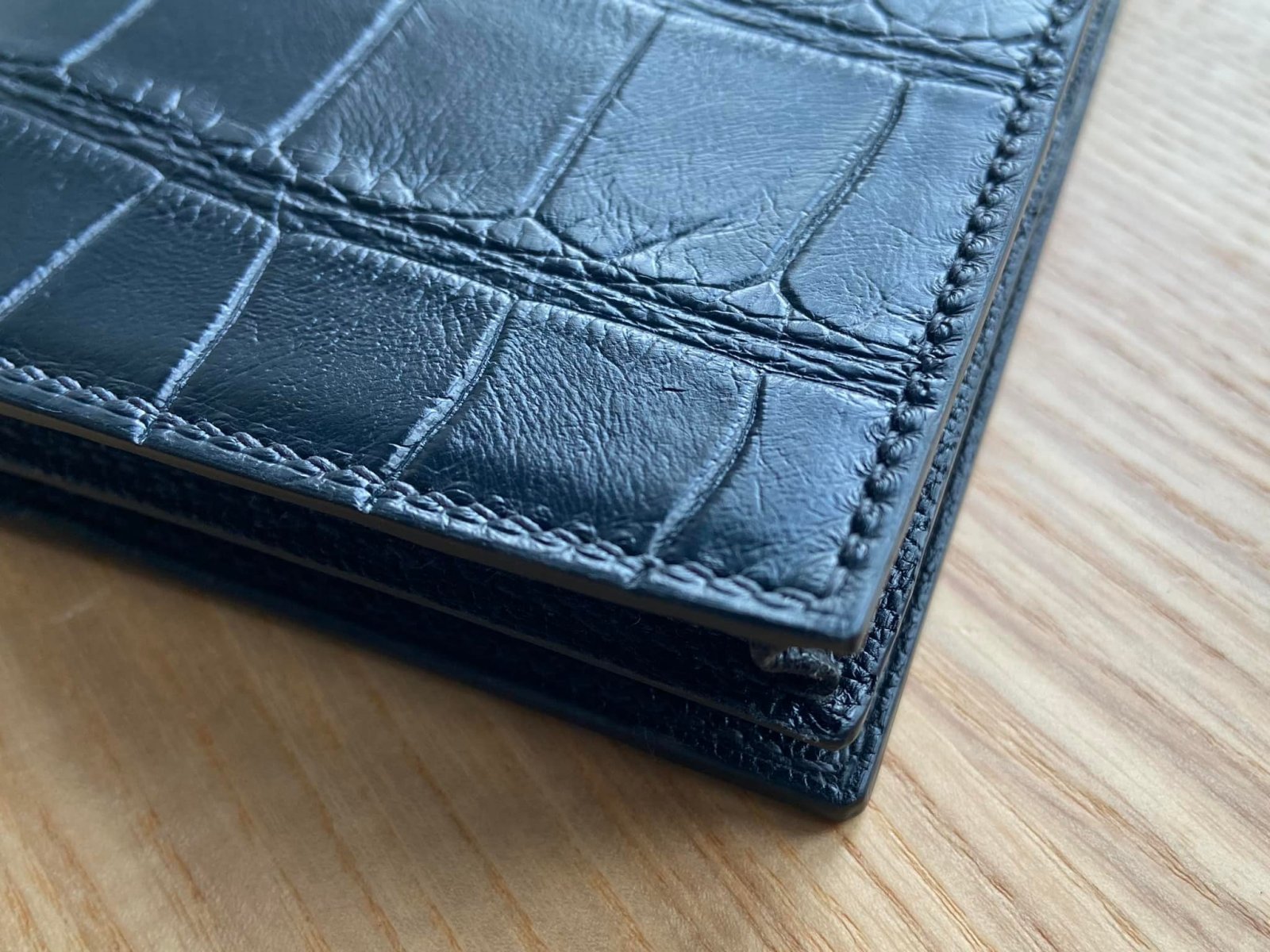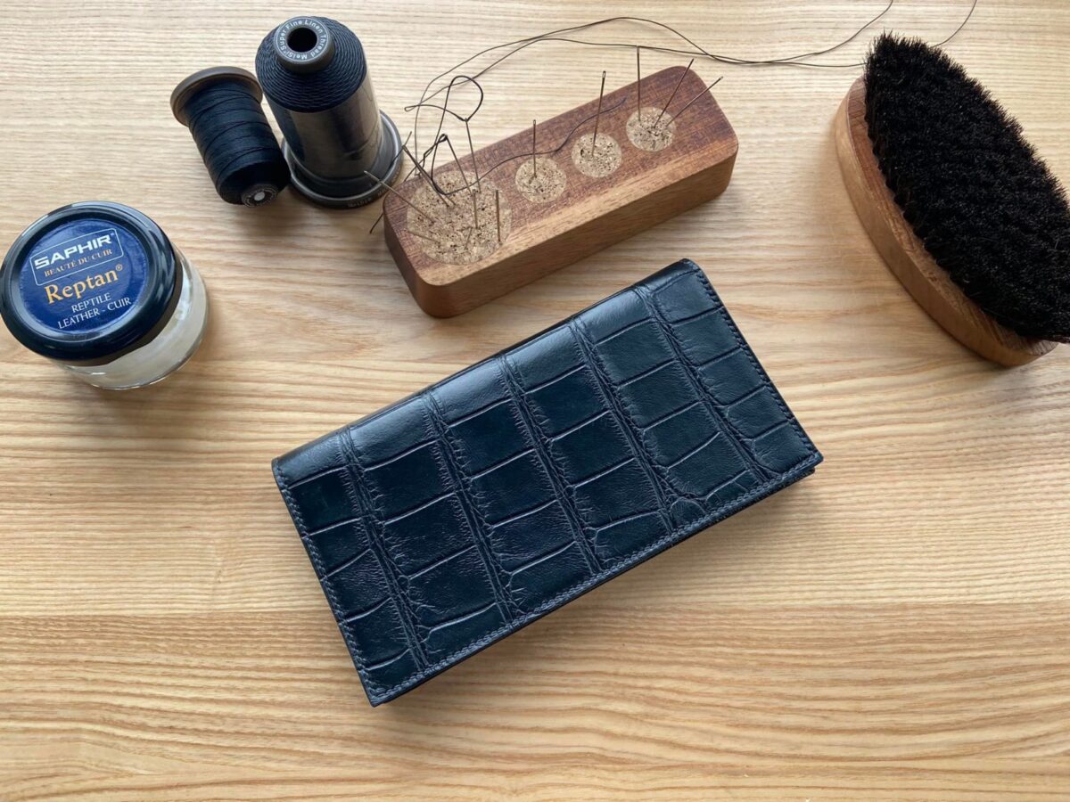 Кошелек ручной работы из кожи крокодила и подкладке из кожи козы. Персонализация инициалами обладателя. 6 отделов для кредитных карт, 3 отдела для бумажных купюр. Один объемный отдел/карман для телефона или денег.