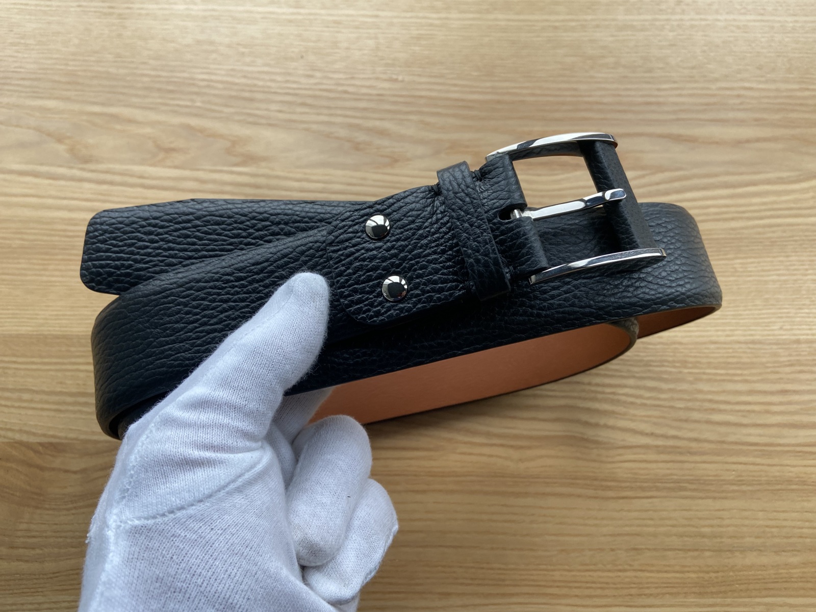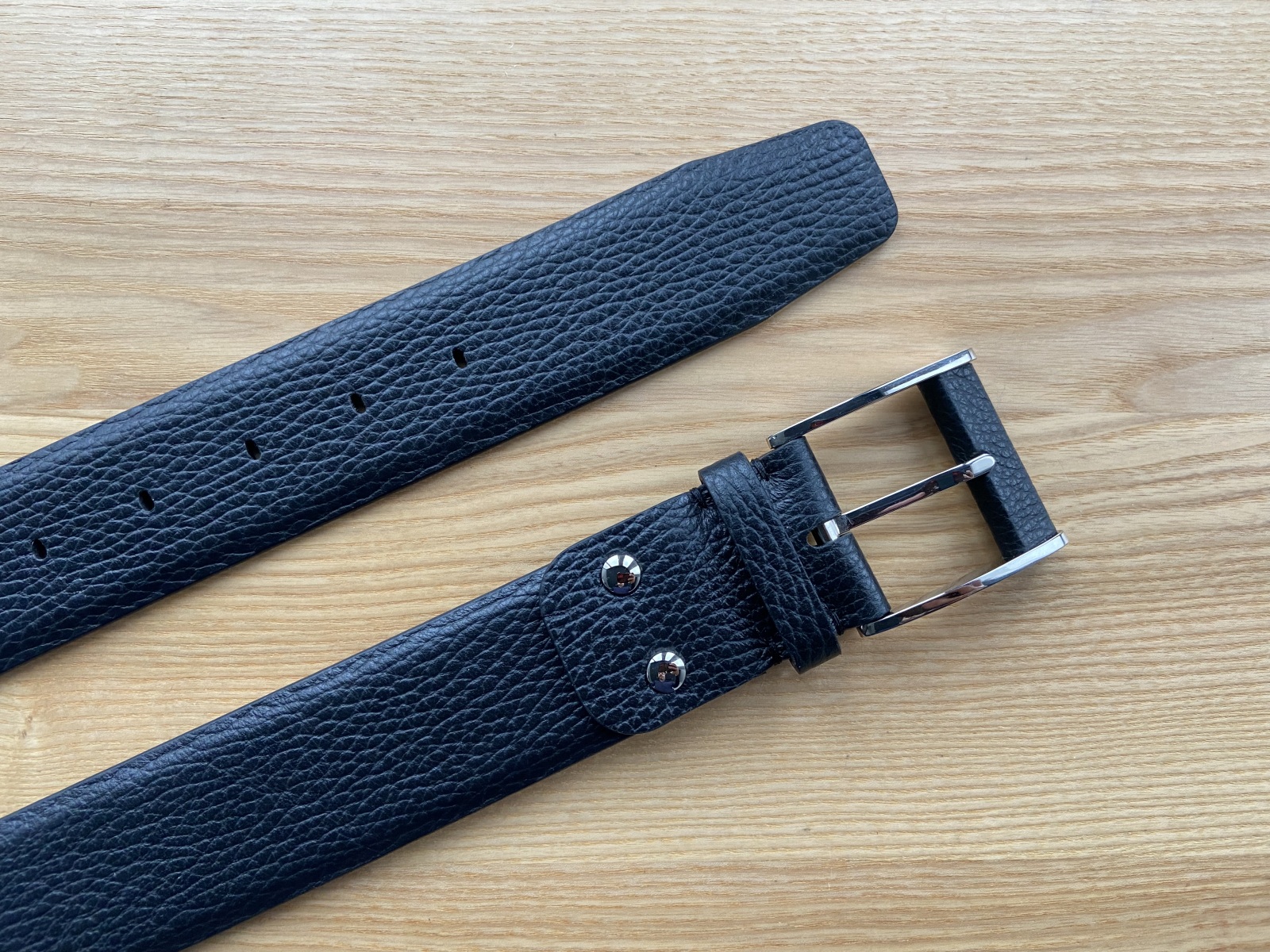 Ремень из матовой кожи черного цвета изготовлен в лучших традициях ручной работы. Ширина: 40 мм. Этот элегантный ремень, незаменимый аксессуар мужской одежды украшен латунной пряжкой с покрытием. Каждый ремень из телячьей, оленьей или крокодиловой кожи выделяется из многих серийных изделий машинного производства, которые вы видите сегодня повсюду.