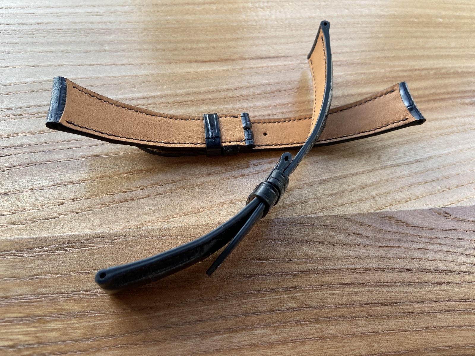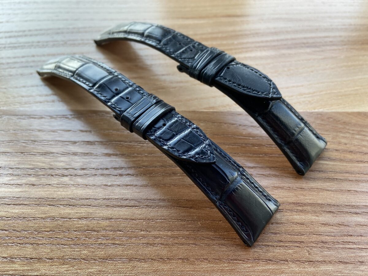 Пара ремешков (чёрный и темно-синий) для часов Ulysse Nardin из кожи аллигатора. Подклад из гипоаллергенной кожи Zermatt. Только ручная работа. Шитьё вручную седельным швом льняной вощеной нитью MeiSi Ua