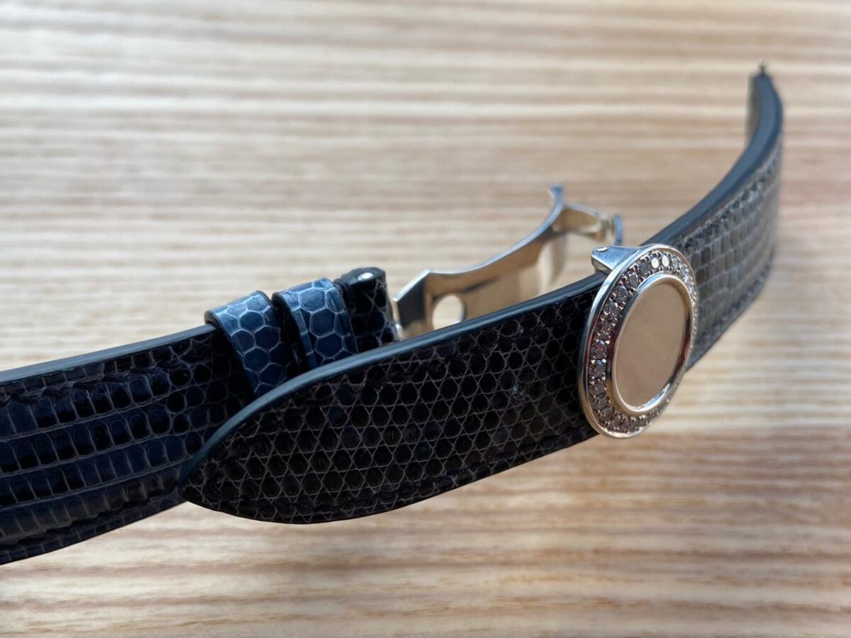 Заказной ремешок для изысканных женских OMEGA Watches De VillE TRESOR. Застежка из белого золота с инкрустацией бриллиантами 29 шт., 0,54 ct. Ювелир Сергей Софронов.Ремешок выполнен из кожи ящерицы Тегу. Ширина 20/18 мм.Подклад из гипоаллергенной водостойкой кожи от Conceria La Bretagna art. Idro Kansas. Шитьё вручную седельным швом льняной вощеной нитью MeiSi.