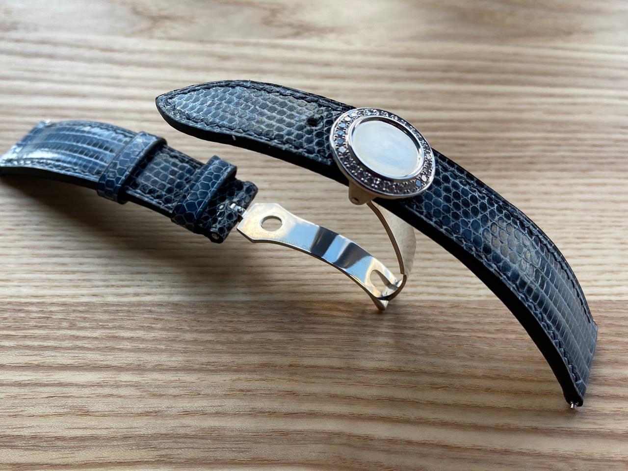 Заказной ремешок для изысканных женских OMEGA Watches De VillE TRESOR. Застежка из белого золота с инкрустацией бриллиантами 29 шт., 0,54 ct. Ювелир Сергей Софронов.Ремешок выполнен из кожи ящерицы Тегу. Ширина 20/18 мм.Подклад из гипоаллергенной водостойкой кожи от Conceria La Bretagna art. Idro Kansas. Шитьё вручную седельным швом льняной вощеной нитью MeiSi.