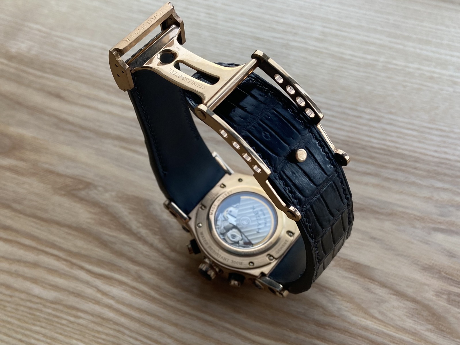 Ремешок для часов от JORG HYSEK выполнен из кожи крокодила. Подклад из гипоаллергенной водостойкой кожи Conceria La Bretagna (Italia). Шитьё вручную седельным швом льняной вощеной нитью MeiSi Europe