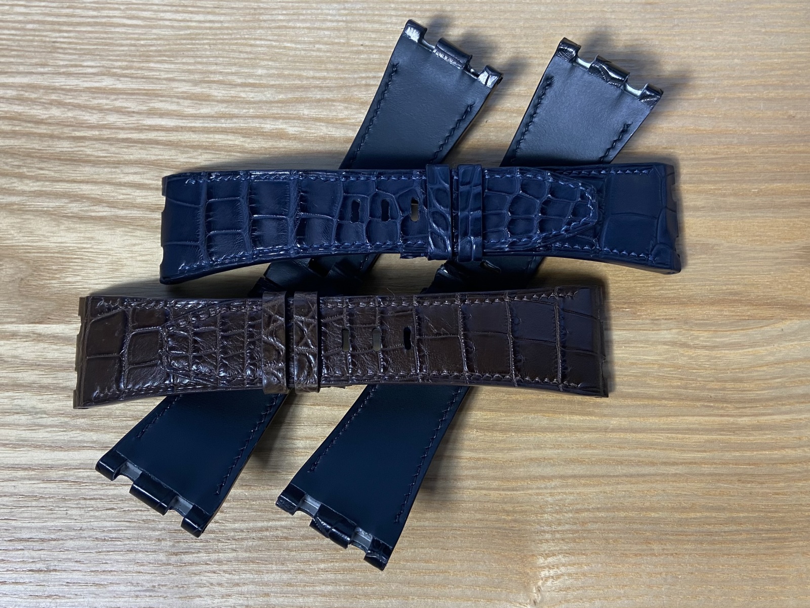 Комплект ремешков для золотых часов Audemars Piguet Royal Oak выполнен из кожи крокодила. Интеграция супинатора. Подклад из гипоаллергенной водостойкой кожи. Шитьё вручную седельным швом льняной вощеной нитью MeiSi Europe.