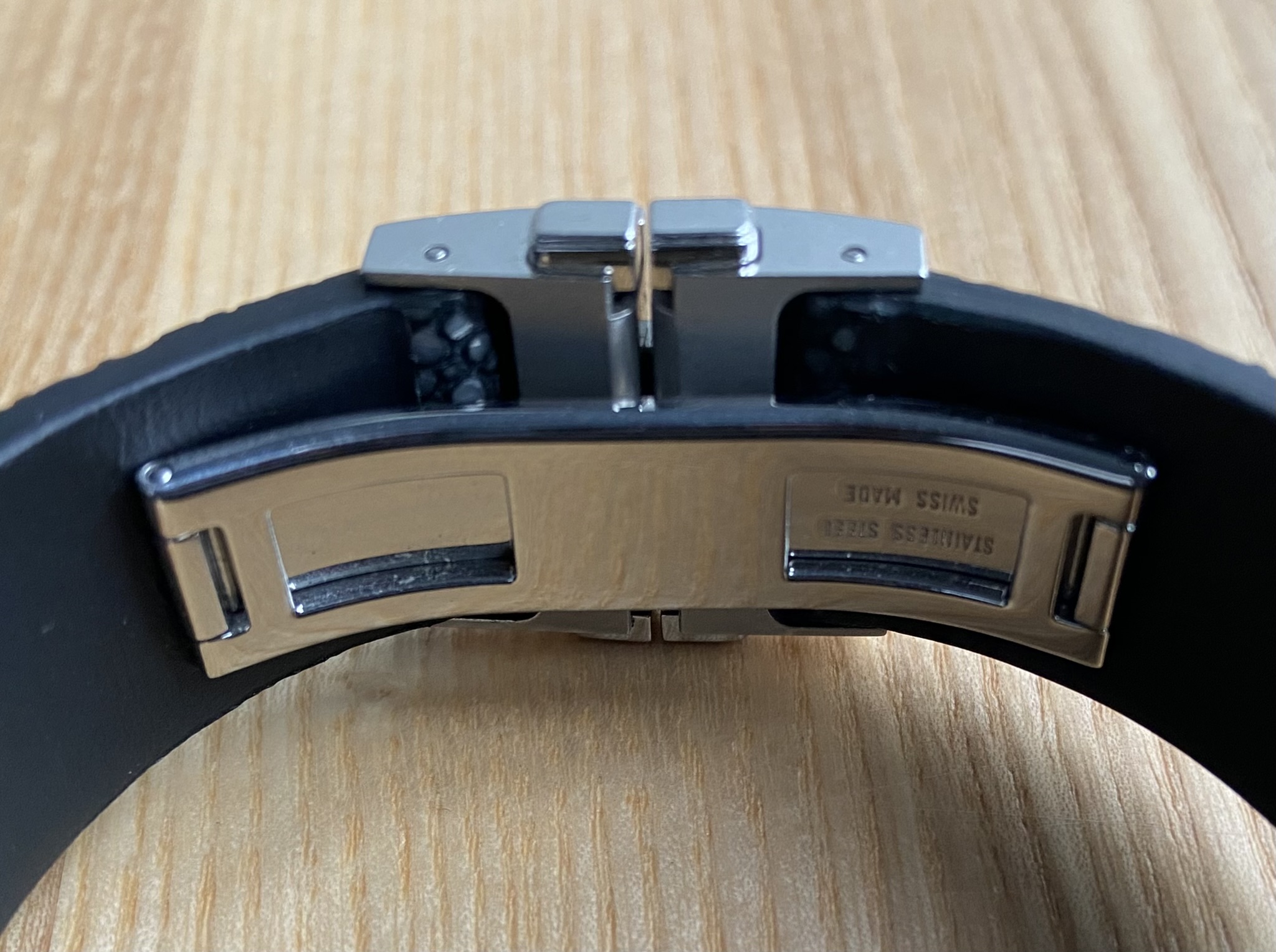 Интересное решение симметричного ремешка от Фаваза Груози хоть и ограничивает возможности по регулировке длины, но определенно меняет восприятие изделия. Подклад из гипоалергенной влагоустойчивой кожи.