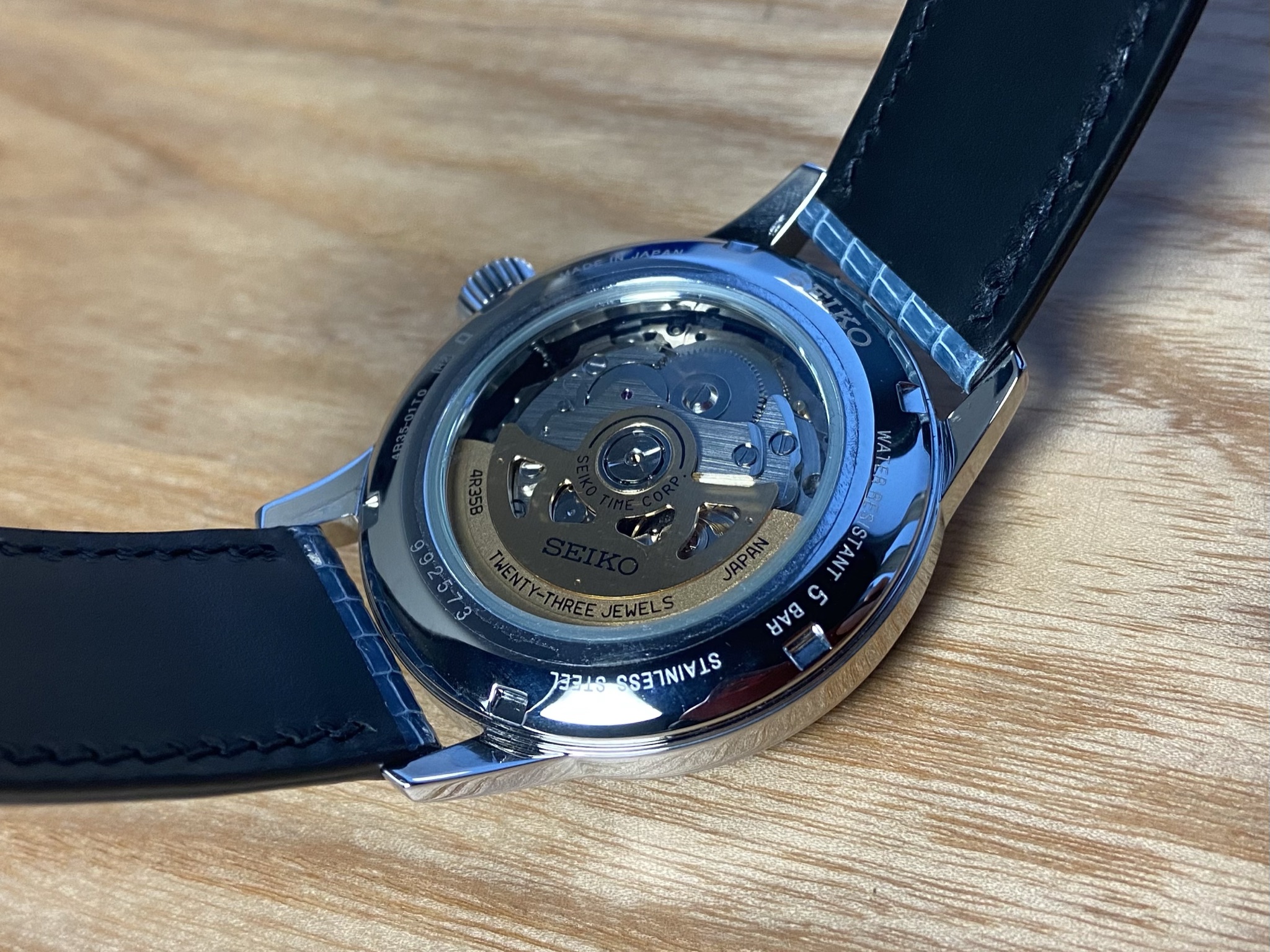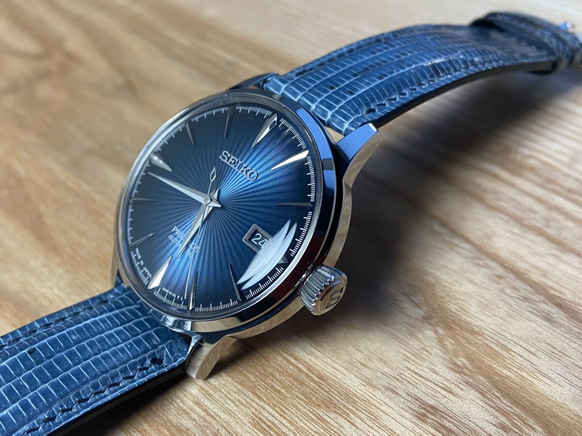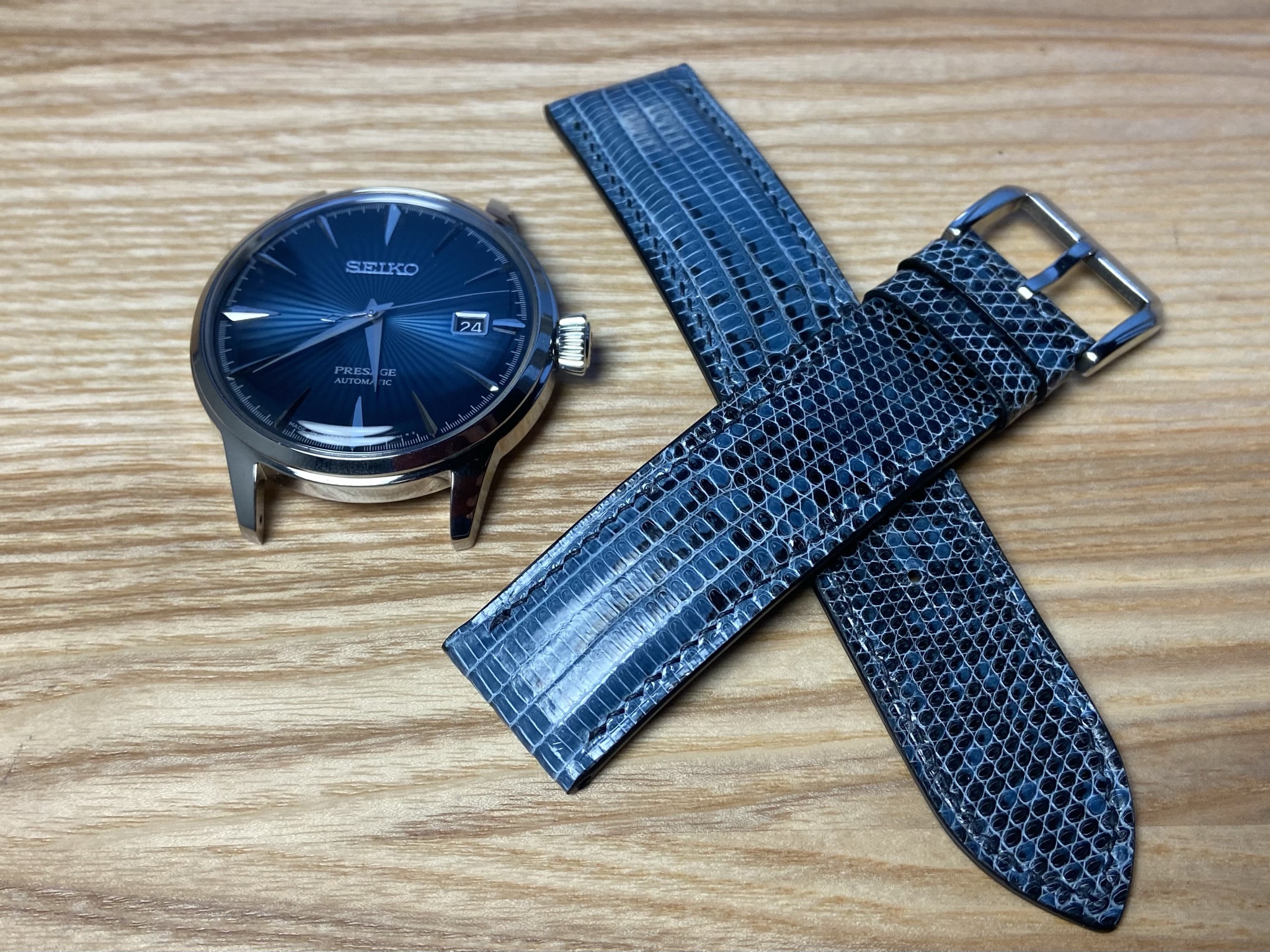 Индивидуальный заказ часового ремешка к Seiko Presage специально для клиента магазина BEZEL. Ремешок выполнен из кожи ящерицы Тегу. Ширина 20/20 мм. Длина 115/75 мм. Подклад из гипоаллергенной водостойкой кожи от Conceria La Bretagna art. Idro Kansas. Шитьё вручную седельным швом льняной вощеной нитью MeiSi.