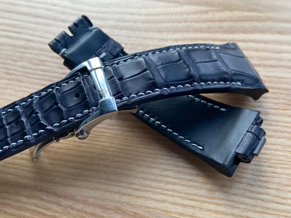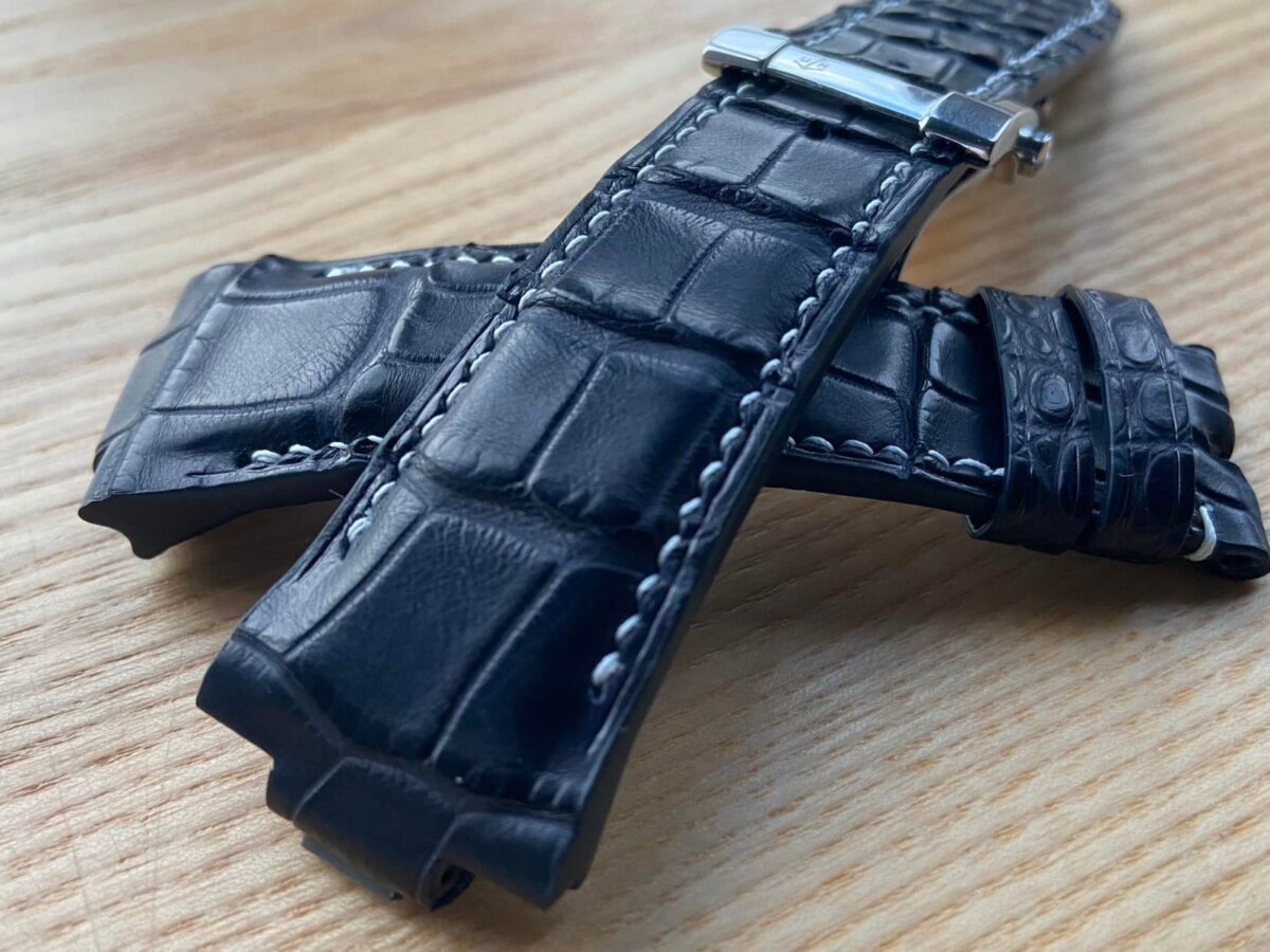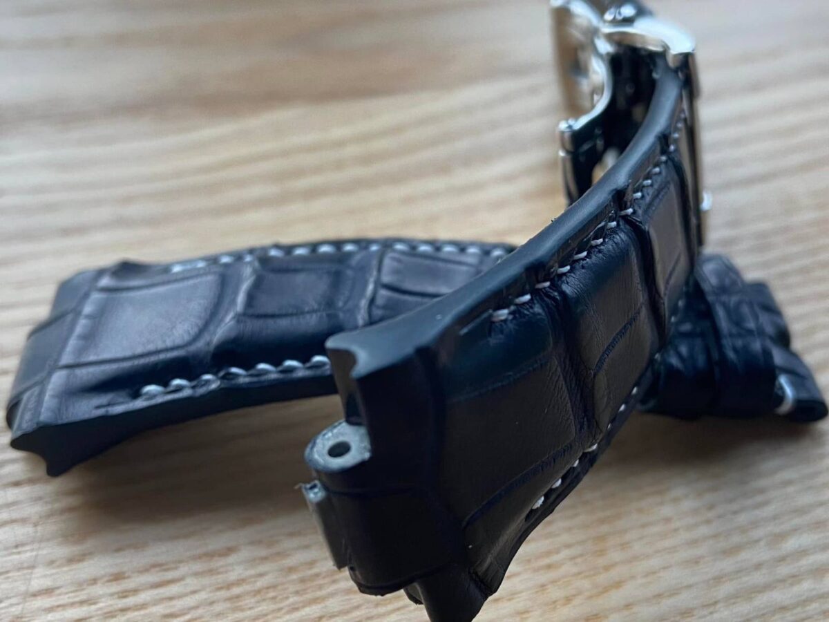 Ремешок к часам Ulysse Nardin выполнен из кожи крокодила с интеграцией супинатора. Подклад из гипоалергенной влагоустойчивой кожи Conceria La Bretagna art. #Idrocansaz. Шитьё вручную седельным швом льняной вощеной нитью MeiSi Super Fine от MeiSi Europe. Усиление от Jaeger.