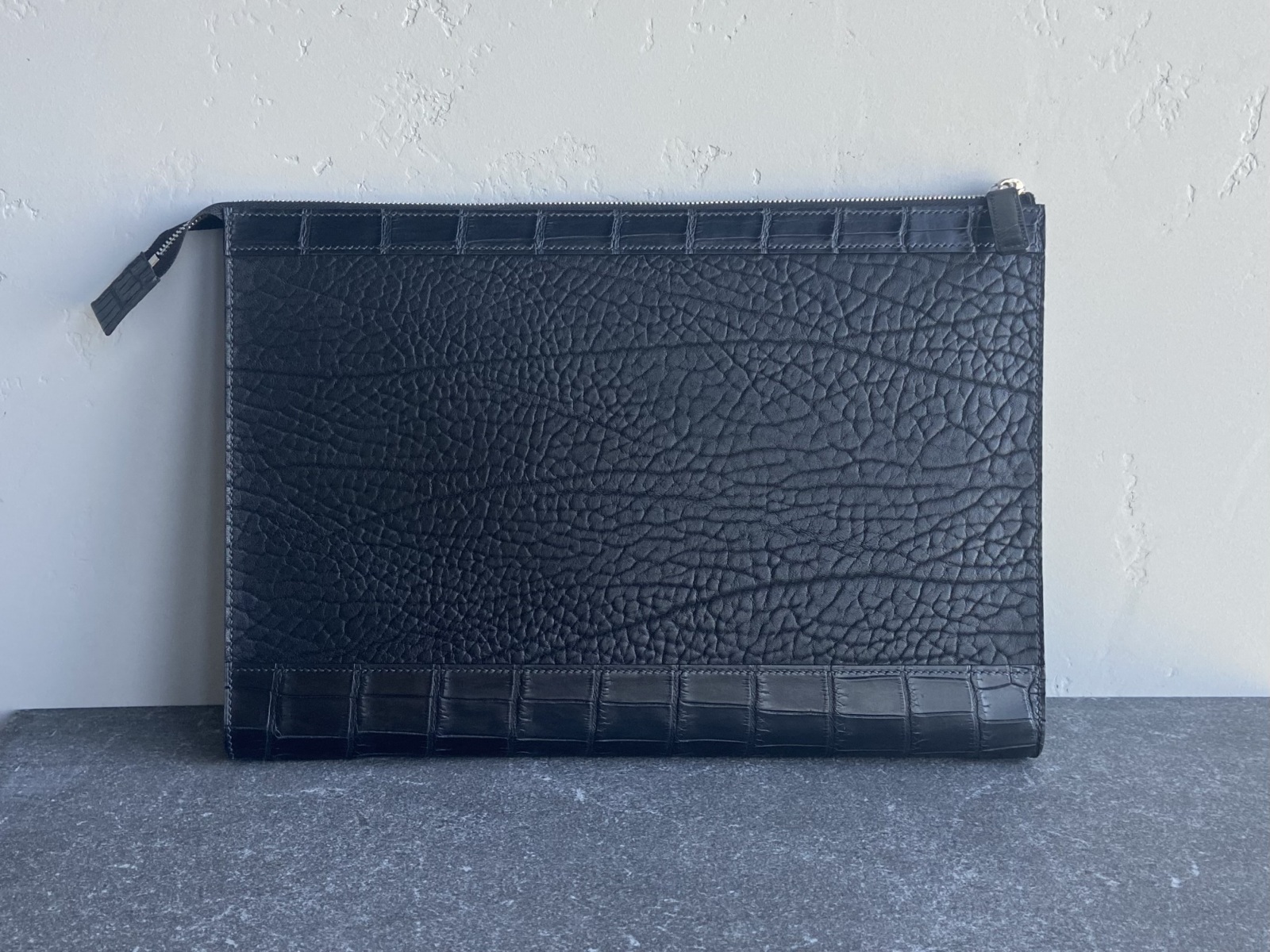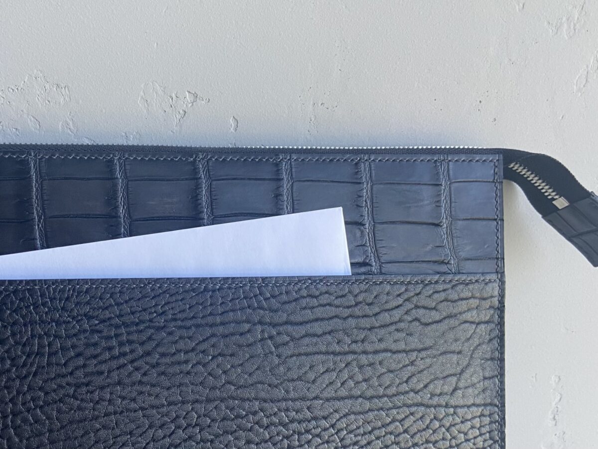Цей чохол-папка для лептопа поєднує елегантність і функціональність у форматі щоденного аксесуара. Виріб виконаний вручну з преміальних матеріалів: у зовнішній частині поєднано шкіру буйвола та шкіру крокодила — контраст двох характерів, який додає виробу глибини й виразності без надмірної демонстративності.