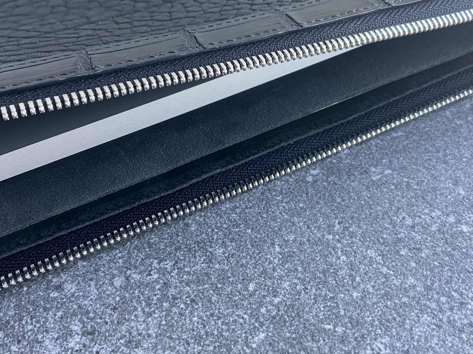 Внутрішній підклад Alcantara м’який та оксамитовий на дотик і делікатно захищає поверхню пристрою, знижуючи ризик подряпин і потертостей. Усередині передбачено два відділи: основний — для лептопа, та додатковий — для документів і паперів, щоб важливі речі завжди були впорядковані й під рукою. Чохол закривається на міцну застібку-блискавку, а зовнішня кишеня дозволяє зберігати дріт для заряджання або невеликі аксесуари й швидко діставати їх без відкривання основного відділу.