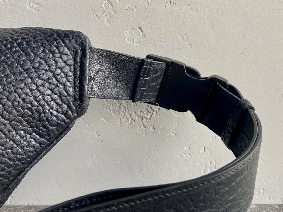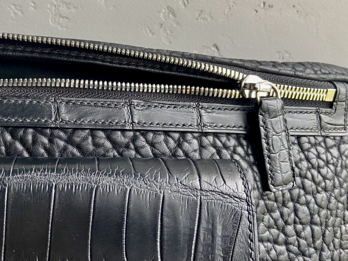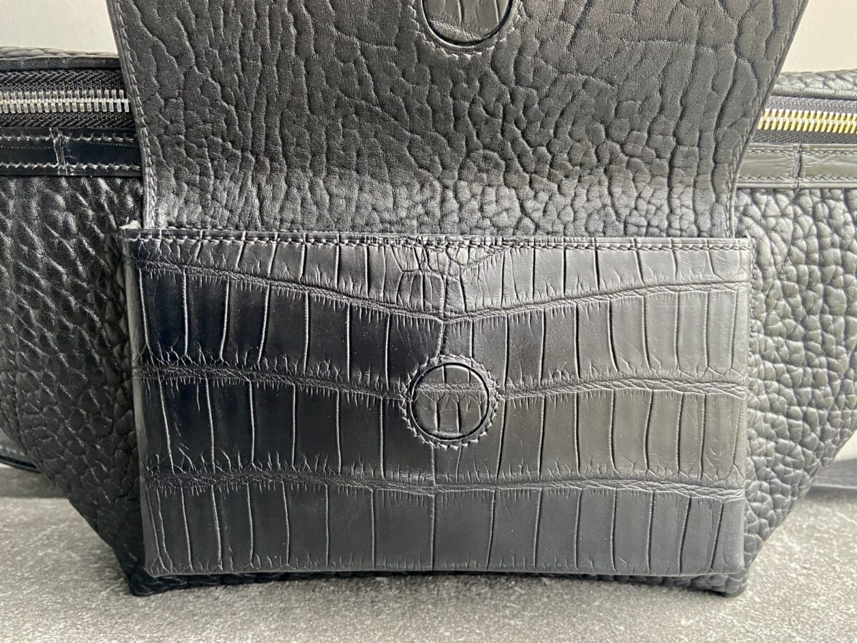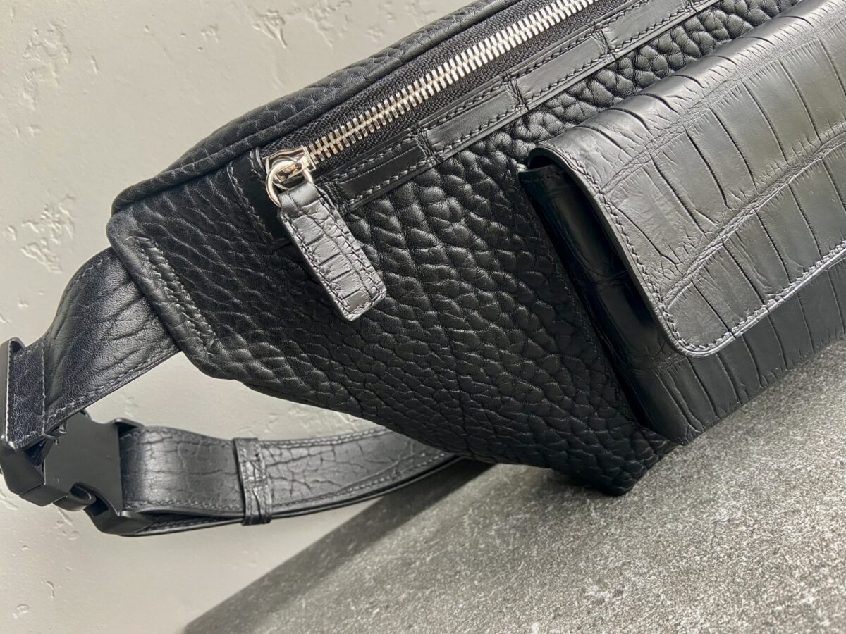 Поясна сумка виготовлена вручну з преміальних матеріалів: підкладки Alcantara, шкіри буйвола та шкіри крокодила. Поєднання фактур створює виразний характер виробу, а природний рисунок шкіри робить кожну сумку унікальною.