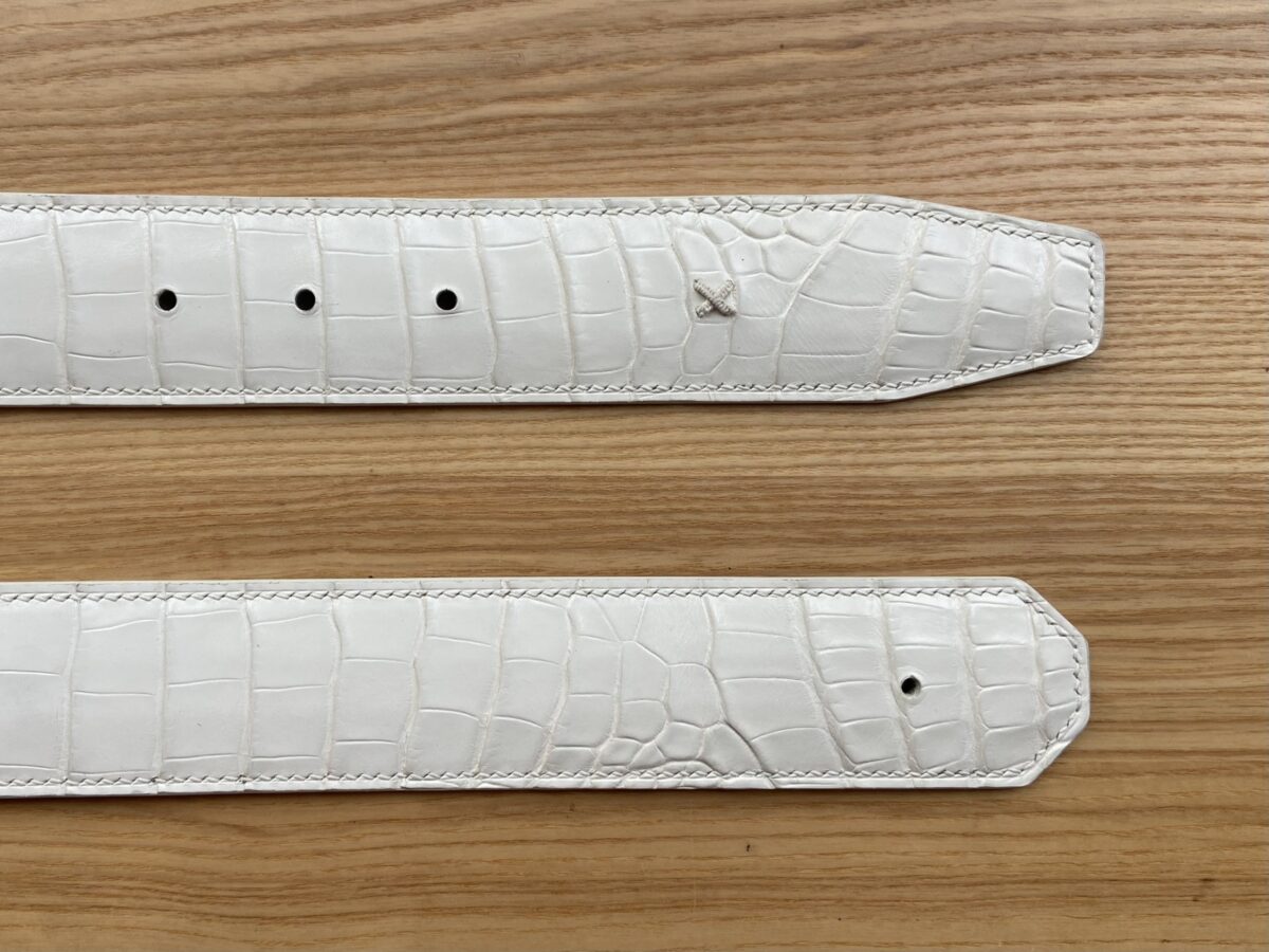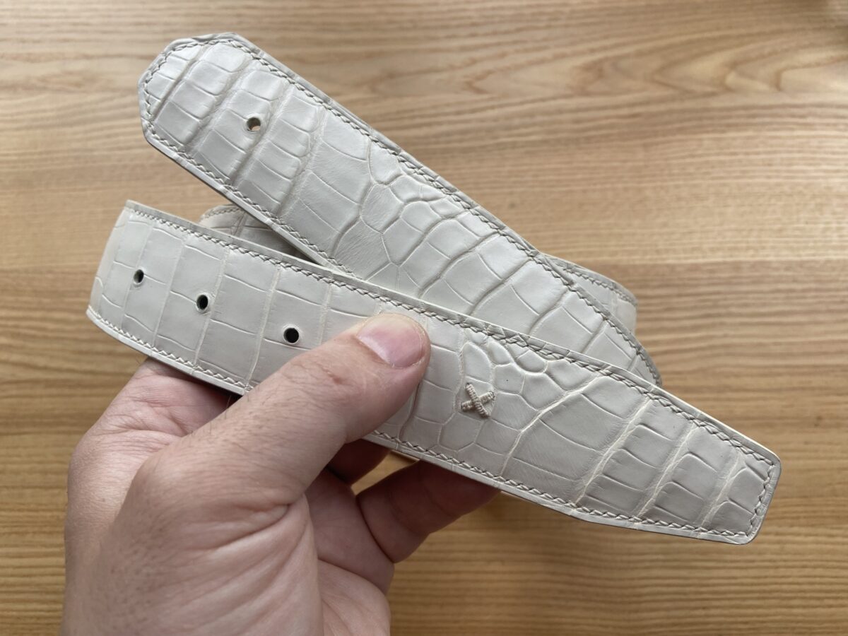 Полотно шириною 40 мм виконано з бежевої фактурної шкіри алігатора з виразним натуральним рисунком. Завданням було зберегти стриманий, чистий вигляд і водночас забезпечити конструктивну стабільність, щоб ремінь залишався рівним і акуратним у повсякденному використанні. Для цього всередині застосовано підсилювачі Jaeger Reinforcements, які допомагають контролювати форму та геометрію.