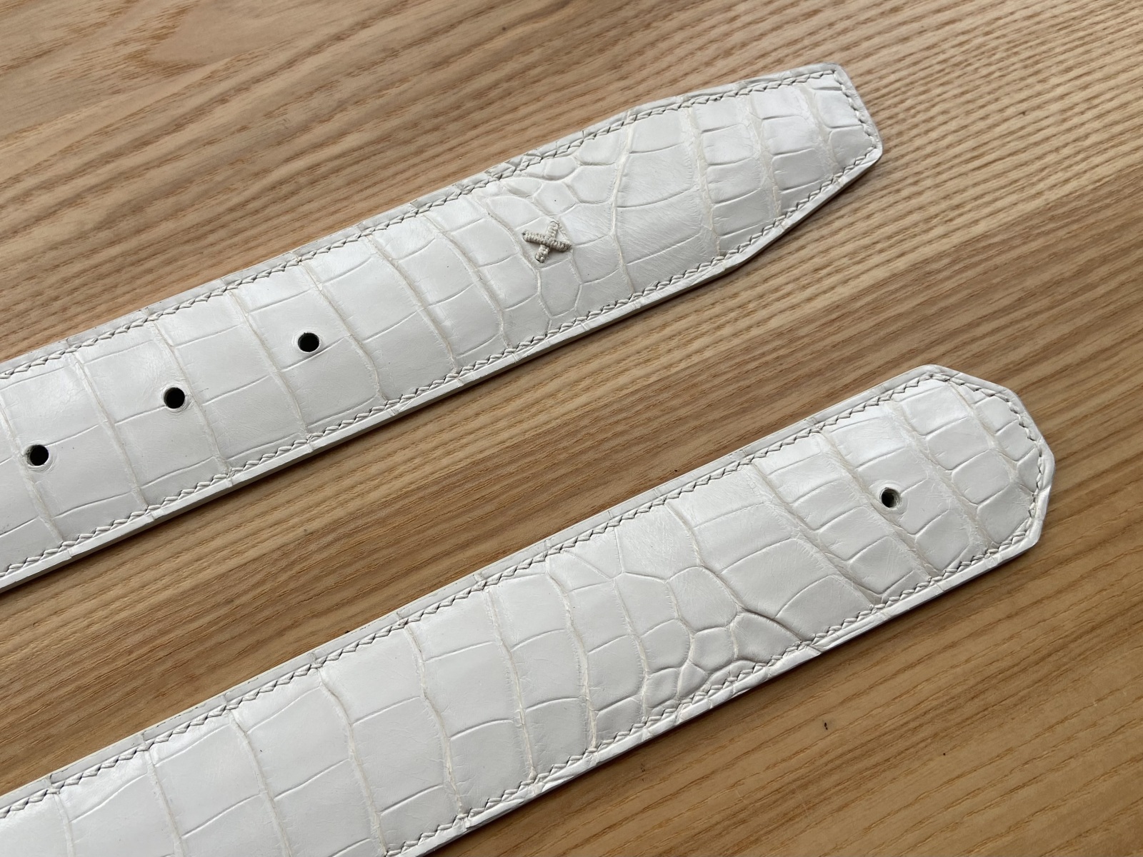 Полотно шириною 40 мм виконано з бежевої фактурної шкіри алігатора з виразним натуральним рисунком. Завданням було зберегти стриманий, чистий вигляд і водночас забезпечити конструктивну стабільність, щоб ремінь залишався рівним і акуратним у повсякденному використанні. Для цього всередині застосовано підсилювачі Jaeger Reinforcements, які допомагають контролювати форму та геометрію.