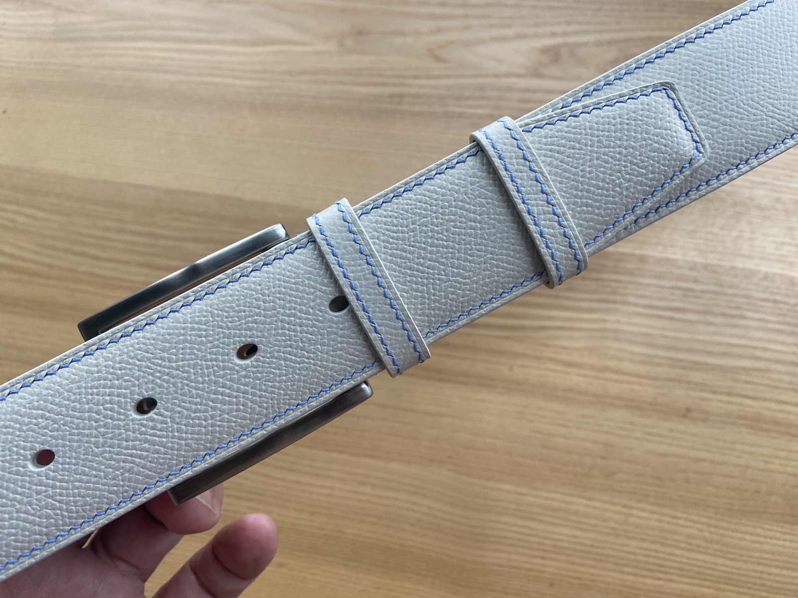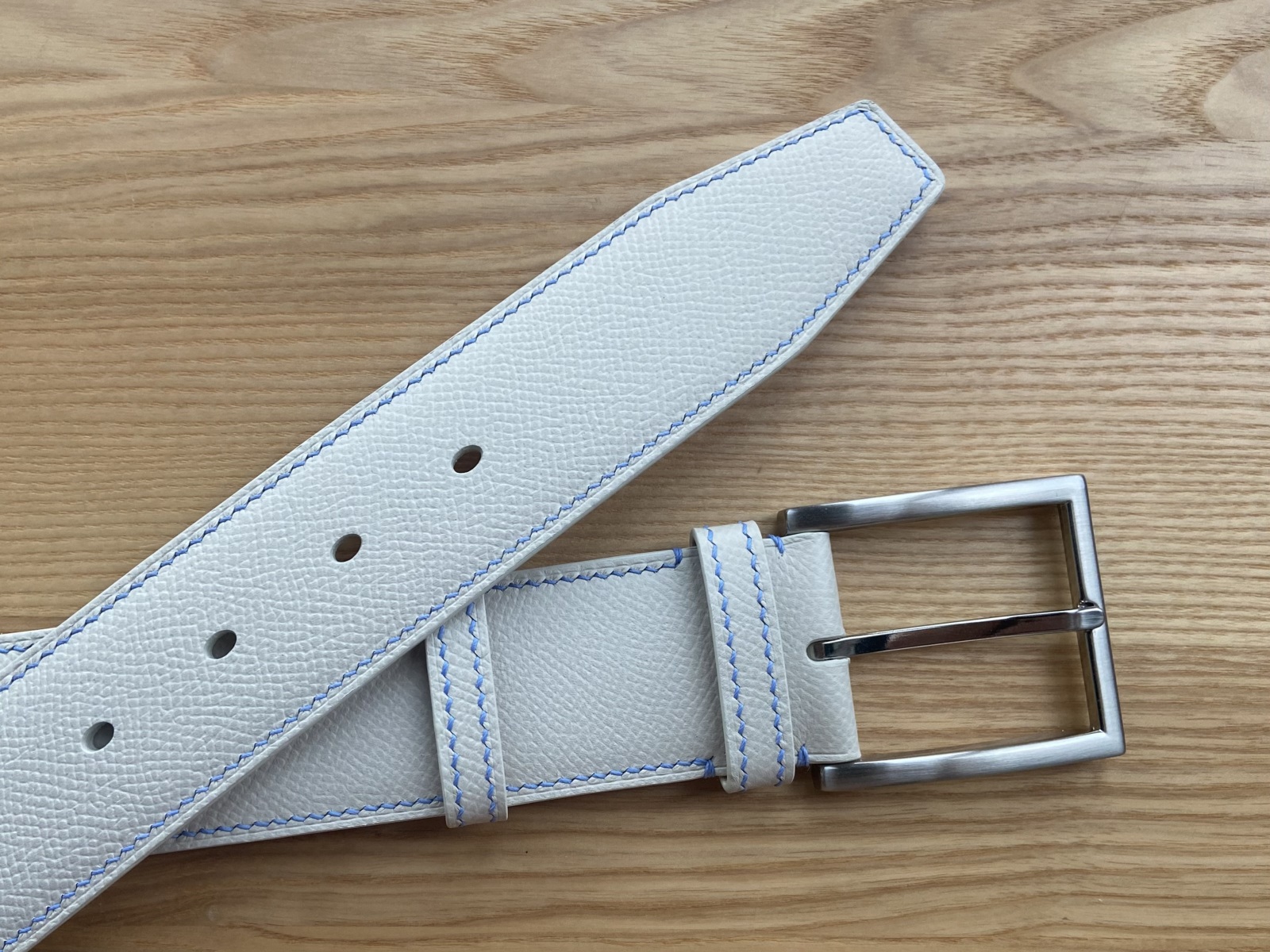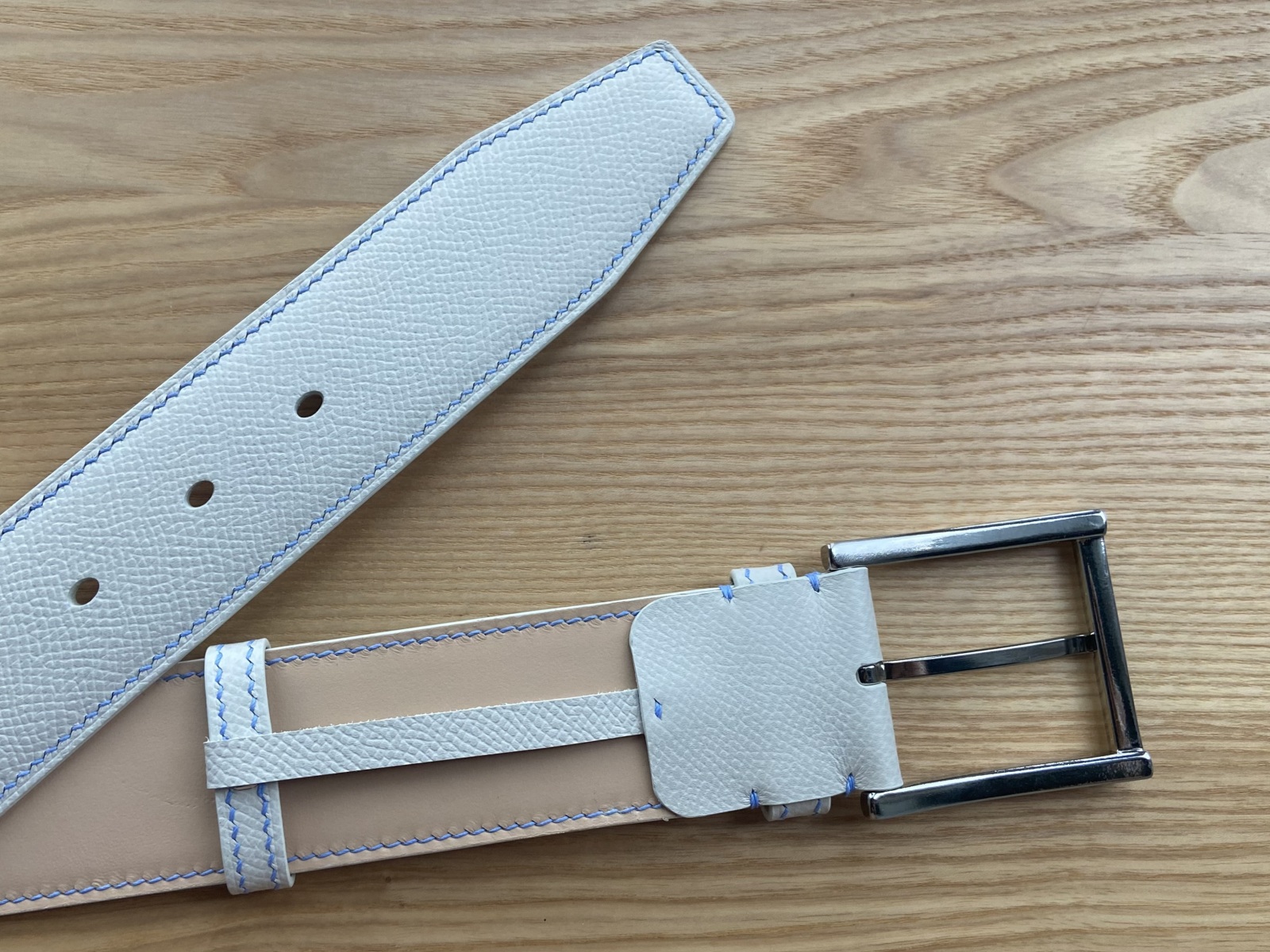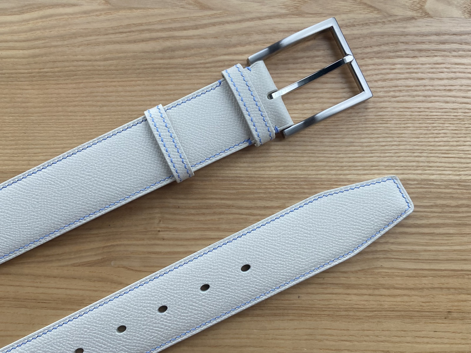 Цей ремінь з матової шкіри Epsom молочного кольору виготовлений у найкращих традиціях ручної роботи. Ремінь прошитий вручну, сідельним швом льняною вощеною ниткою молочного кольору. Цей метод шиття забезпечує ременю міцність і довговічність. Ширина смуги 40 мм.
