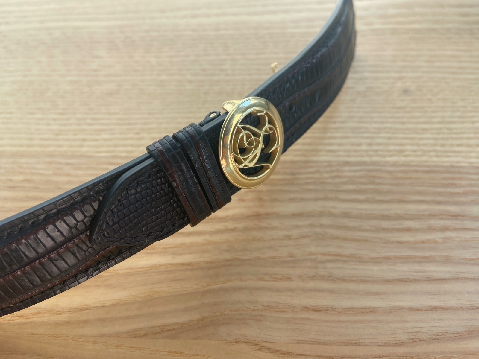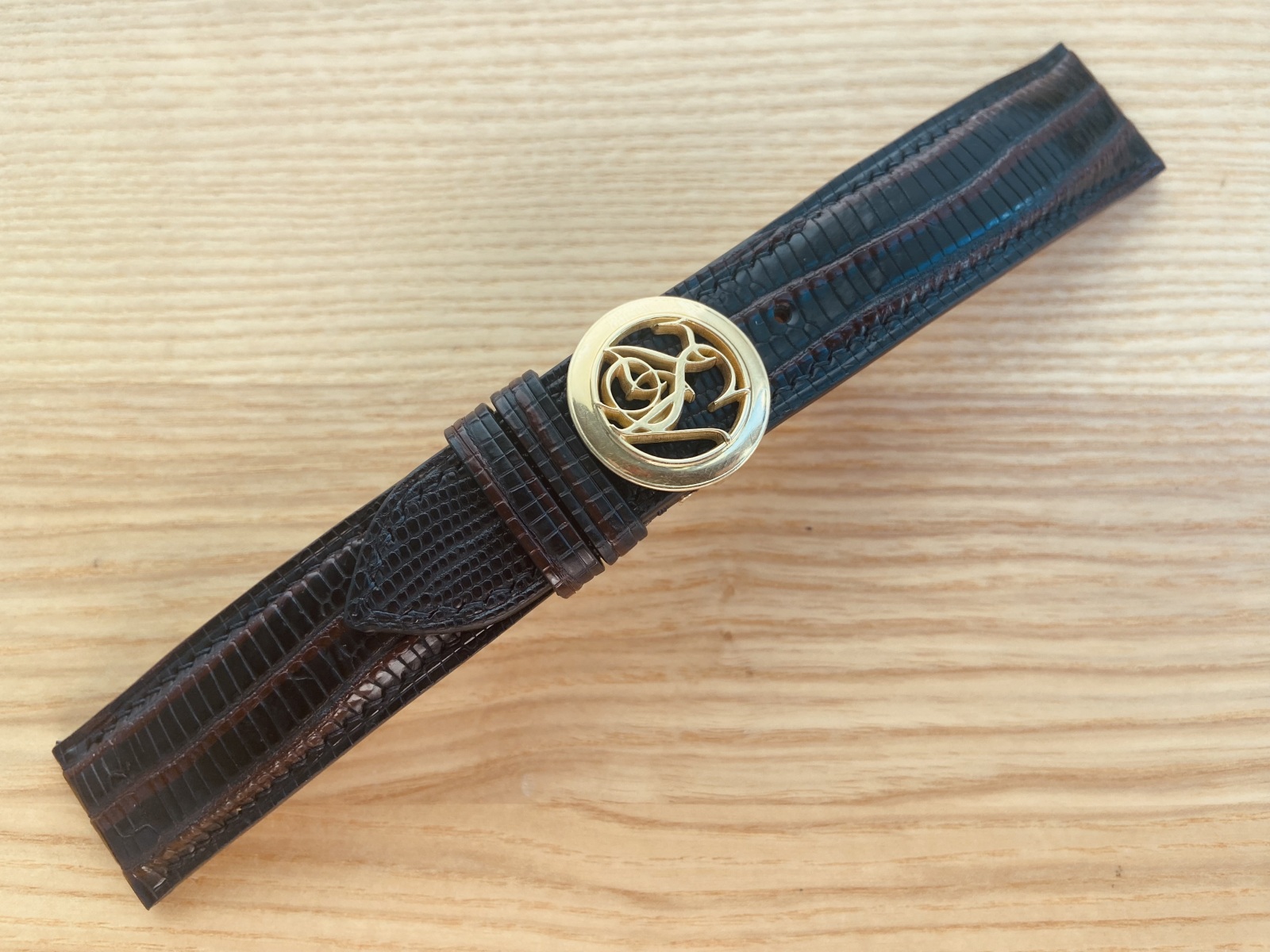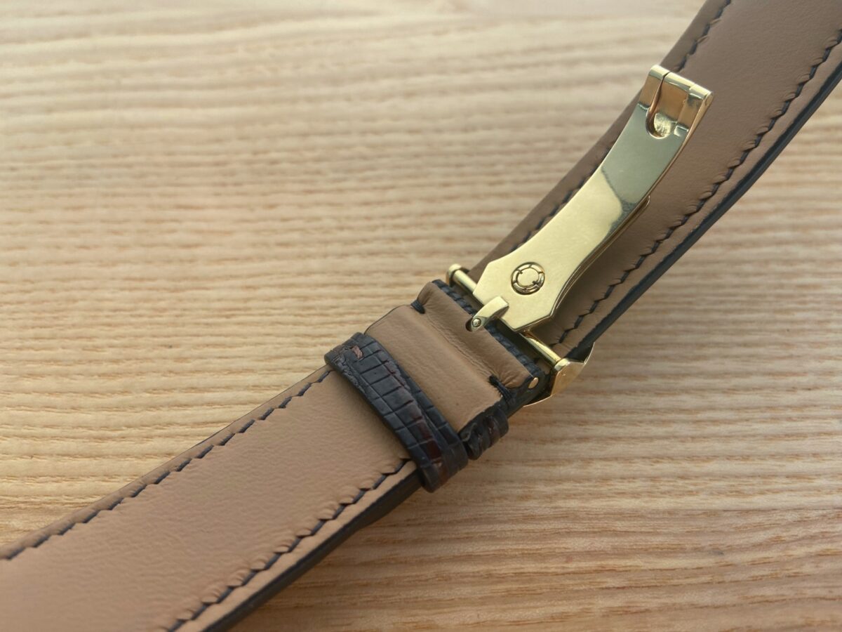 Ремінець виконаний з фактурної шкіри ящірки тегу — матеріалу з дуже дрібним, рівним рисунком. Поруч із золотом він працює делікатно: додає глибину поверхні, але не перетягує увагу на себе. Конструкція та геометрія ремінця підганялися під конкретну посадку й під роботу кліпси, щоб у зоні прилягання все виглядало зібрано й точно.