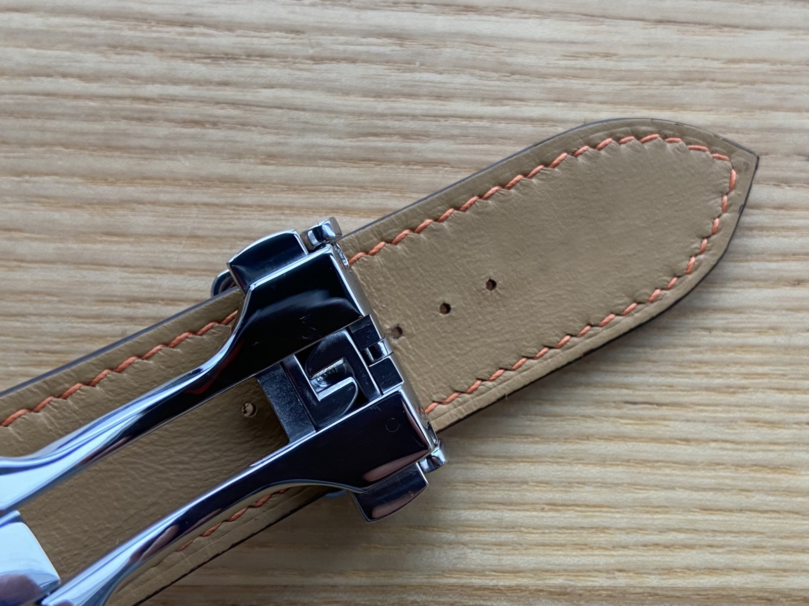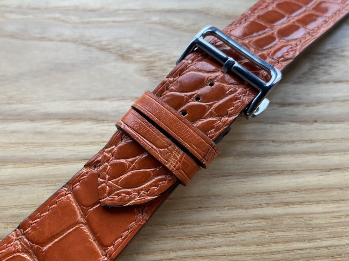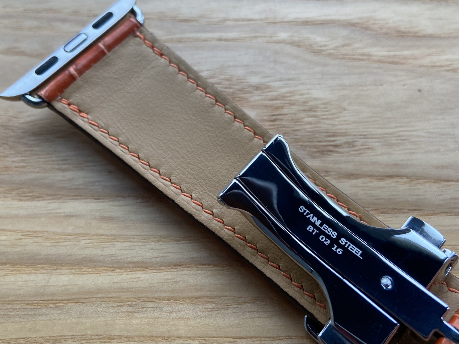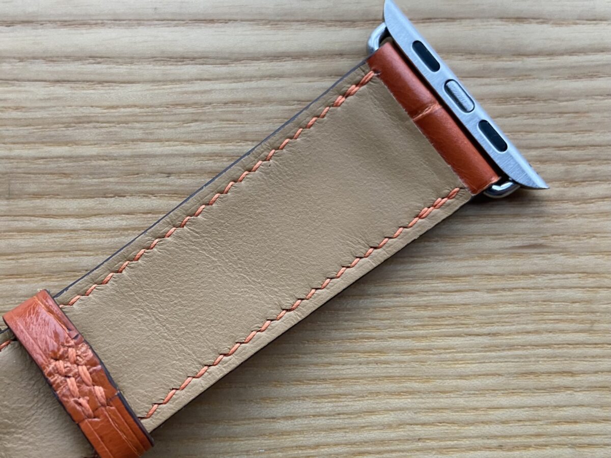 Зшивання виконано вручну вощеною лляною ниткою MeiSi Linen Super Fine, що забезпечує акуратну, рівну лінію шва та точний контроль на кожному етапі роботи. Ремінець спроєктований саме під Apple Watch Series 7 та сумісний з корпусом Hermès 45 mm, з коректною посадкою та чистою геометрією по краях.